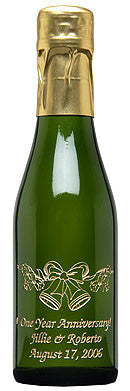 A beautiful wedding favor of golden wedding bells and an abundance of flowers! Three lines of personalization included. Each bottle is a single-serving (187 ml) of California champagne or Sparkling Cider Juice. We add a brilliant gold or silver colored capsule to complete the feeling of festive elegance. Favor bottles sold in 6 bottle sets.  Discounts begin at 12 bottles (2 sets).