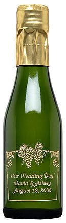 A fabulous grape themed frame makes for the perfect favor of a wine country wedding! Three lines of personalization included. Each bottle is a single-serving (187 ml) of California champagne or Sparkling Cider Juice. We add a brilliant gold or silver colored capsule to complete the feeling of festive elegance. Available exclusively in case quantities. Favor bottles sold in 6 bottle sets. Discounts begin at 12 bottles (2 sets). Enjoy!